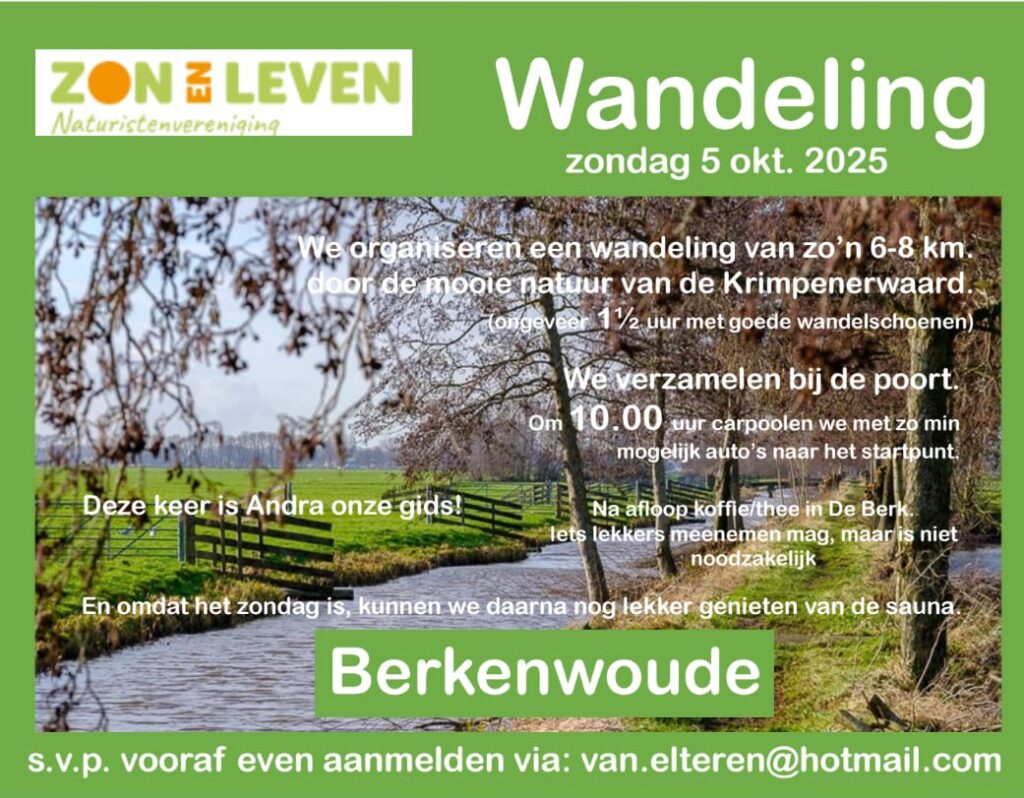 Op zondag 5 oktober wordt een wandeling door de mooie Krimpenerwaard georganiseerd. Verzamelen om 10.00 uur bij de poort. Vandaar gaan we met een aantal auto’s naar het startpunt van de wandeling.